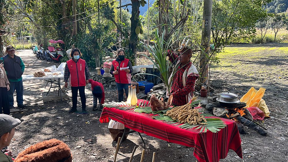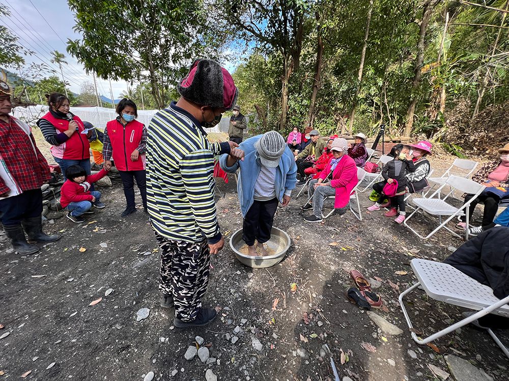 參與部落文化健康站(樂齡中心)的耆老們在播種小米前舉行播種儀式,並用腳脫粒播種用的種粟