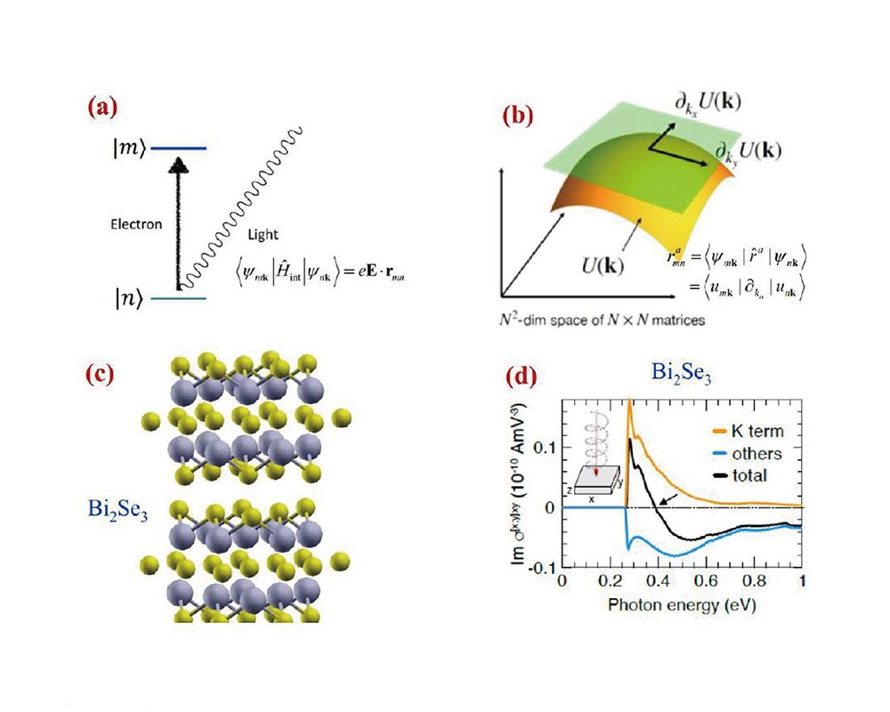 將 (a) 光激發電子躍遷矩陣元,當作 (b) 固體布洛赫電子態空間之流形體的切向量。典型的拓撲絕緣體三硒化二鉍的 (c) 晶體結構和 (d) 三階圓偏振光伏霍爾效應的光電導。(d) 顯示在光吸收帶邊附近,光電導能譜主要來自黎曼曲 率的貢獻 (K term)。