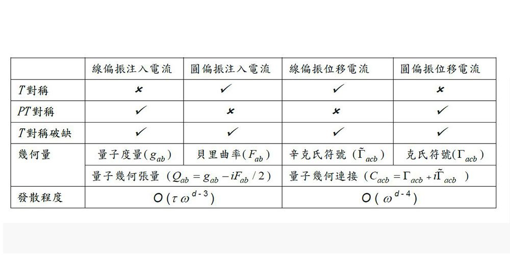 對多數學者而言,微分幾何學是一門艱澀的抽象數學。然而,電子態的微分幾何結構(量子幾何)是近年來物理學者理解電子系統對靜態電磁場響應的基礎,例如量子霍爾效應源於半導體量子井中二維電子氣電子態的貝里曲率及其積分的拓撲不變性。然而,如何將量子幾何與物質光學響應作聯接則具挑戰性。最近,國家理論科學中心主任、本校物理系教授郭光宇和日本理化學研究所,東京大學及哈佛大學學者,應用指數計算和對稱分折,探討維爾和狄拉克粒子模型,發現拓撲半金屬在太赫茲電磁輻射下會產生龐大的體光伏效應,同時體光伏效應產生的四種光電流完全取決於費米能階附近電子態的幾何量如量子度量和貝里曲率(表一)。體光伏效應是指空間反轉對稱破缺的材料在光的照射下直流光電流的產生(圖一),是一種物質二階非線性光學響應。由於體光伏效應在光伏太陽能電池和太赫茲輻射檢測領域有應用前景,近年來引起人們的高度關注。例如,太赫茲電磁波的高靈敏檢測可能是第六代 (G6) 手機通信的關鍵技術之一。