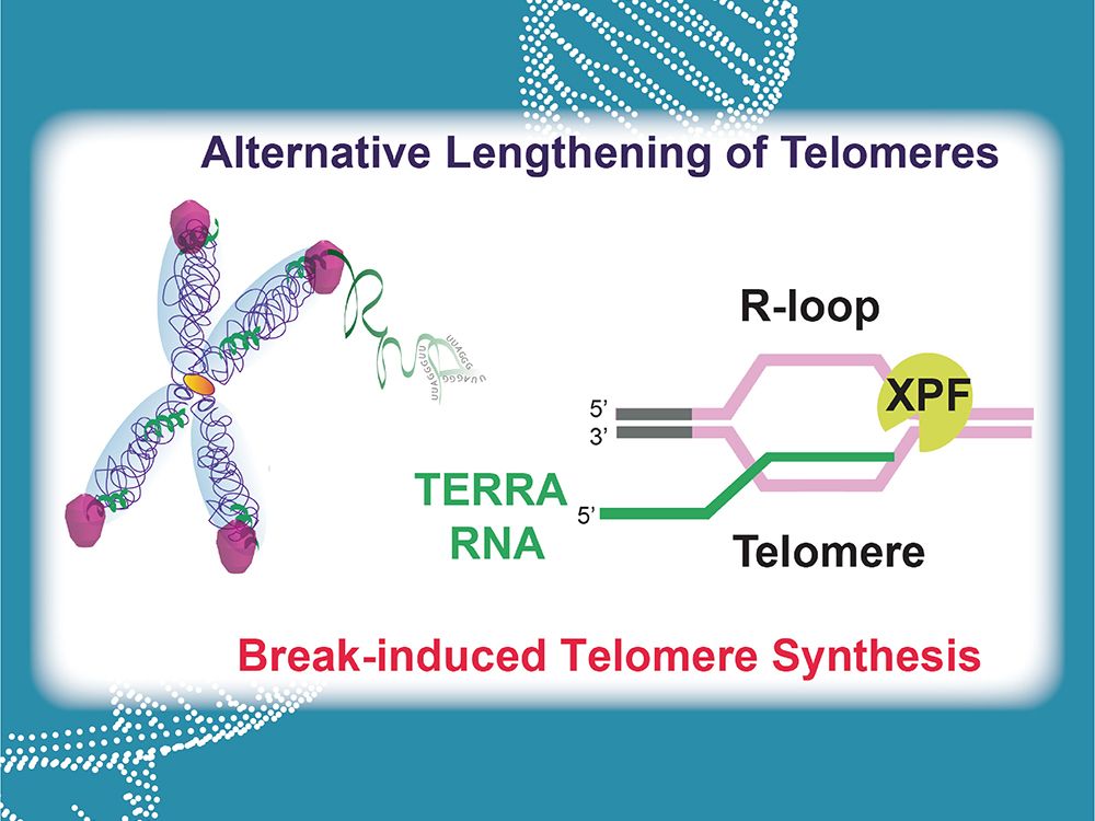 染色體的末端轉錄出TERRA RNA,與端粒DNA 形成迴圈 (R-loop),其特殊結構會誘導XPF內切酶到端粒上,並產生DNA 斷裂,促進DNA 損傷的訊息,以啟動DNA生成機制來延長端粒---此為非典型端粒延長模式 。