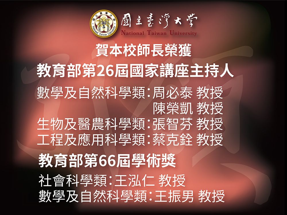 恭賀本校師長榮獲教育部第26屆國家講座主持人與第66屆學術獎,全校師生致上誠摯恭賀並同感榮耀,獲獎師長分別是: