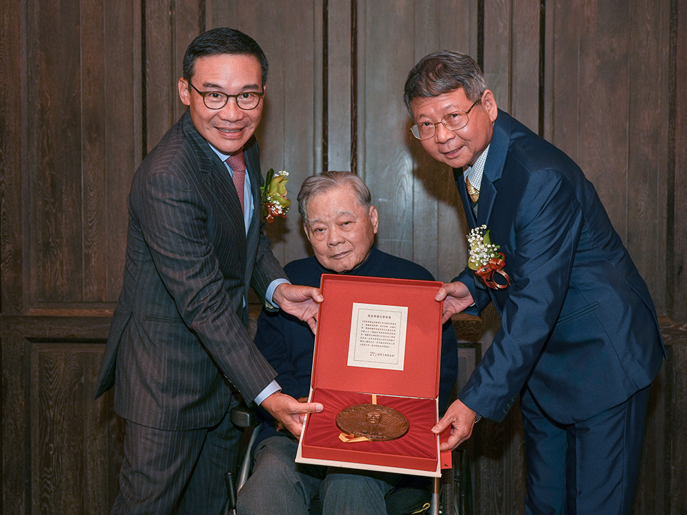 東和鋼鐵集團侯貞雄榮譽董事長(中)及侯傑騰董事長(左)頒發獎座予獲獎人林新智教授。