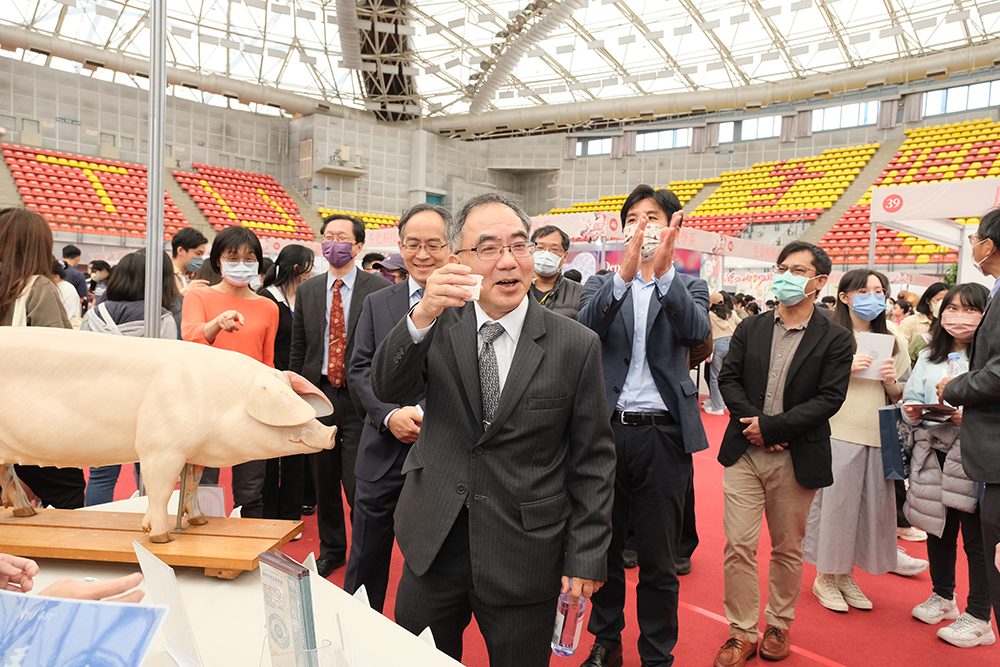 吸引許多年輕學子來參加。圖為臺大校長陳文章參觀學系博覽會,品嘗動物科學技術學系飼養乳牛所生產的牛奶。