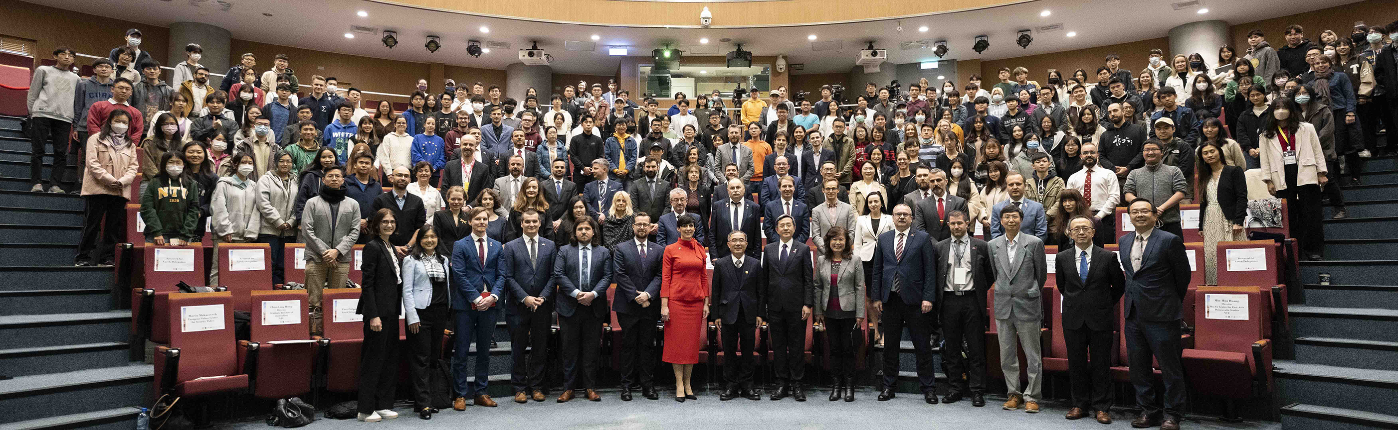 捷克訪團代表及本校師生於臺灣-捷克民主韌性論壇中合影。(第一排由左至右臺大新聞研究所所長洪貞玲、網路與資訊安全機構副主任Pavel Štěpánik、歐洲價值安全政策中心執行長Jakub Janda、歐洲價值安全政策中心葉皓勤主任、捷克經濟文化辦事處代表David Steinke、艾達莫娃議長、陳文章校長、外交部李淳政務次長、袁孝維國際長、議員Pavel Žáček、恐怖主義與混合威脅中心總監Benedikt Vangeli)。