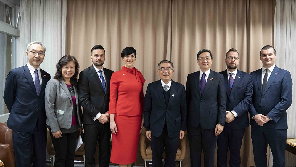 陳文章校長與袁孝維國際長接待艾達莫娃議長等人(由左至右外交部歐洲司姚金祥司長、袁孝維國際長、議長夫婿Tomáš Pekara、艾達莫娃議長、陳文章校長、外交部李淳政務次長、捷克經濟文化辦事處代表David Steinke、歐洲價值安全政策中心執行長Jakub Janda)。