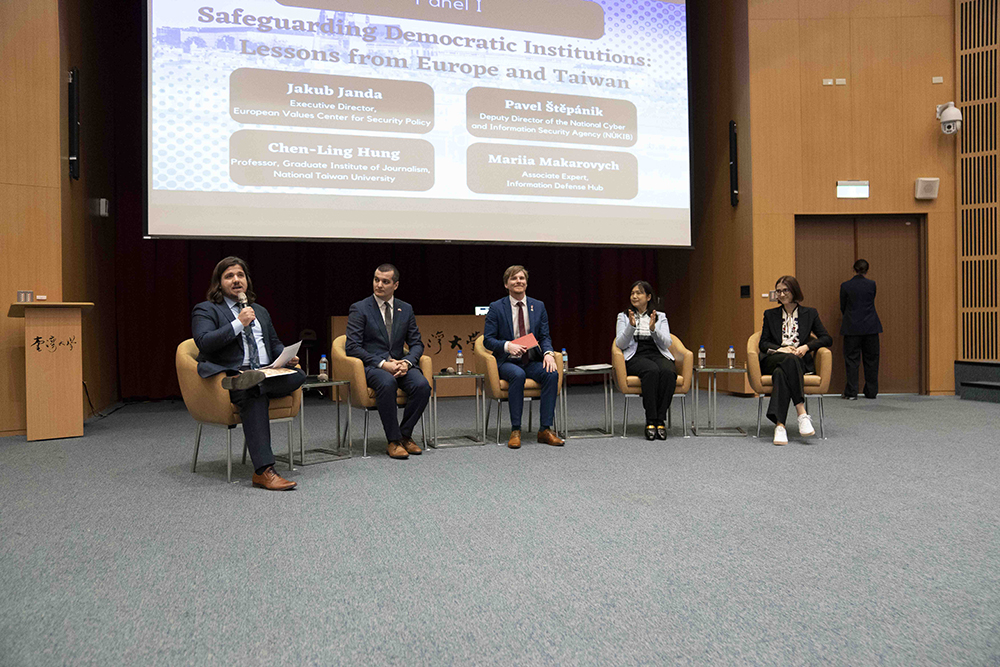 臺灣-捷克民主韌性論壇座談中討論捷克、臺灣與烏克蘭三國如何守護民主機構(由左至右歐洲價值安全政策中心葉皓勤主任、歐洲價值安全政策中心執行長Jakub Janda、網路與資訊安全機構副主任Pavel Štěpánik、臺大新聞研究所所長洪貞玲、歐洲價值安全政策中心專家Mariia Makarovych¬)。