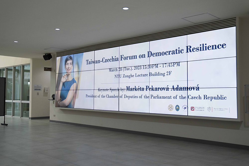 捷克眾議院艾達莫娃議長(Markéta Pekarová Adamová)率領三十餘名捷克代表於3月28日下午參訪國立臺灣大學,出席臺大和捷克智庫歐洲價值安全政策中心(European Values Center for Security Policy)合辦的臺灣-捷克民主韌性論壇(Taiwan-Czechia Forum on Democratic Resilience),由臺大校長陳文章偕國際長袁孝維接待。