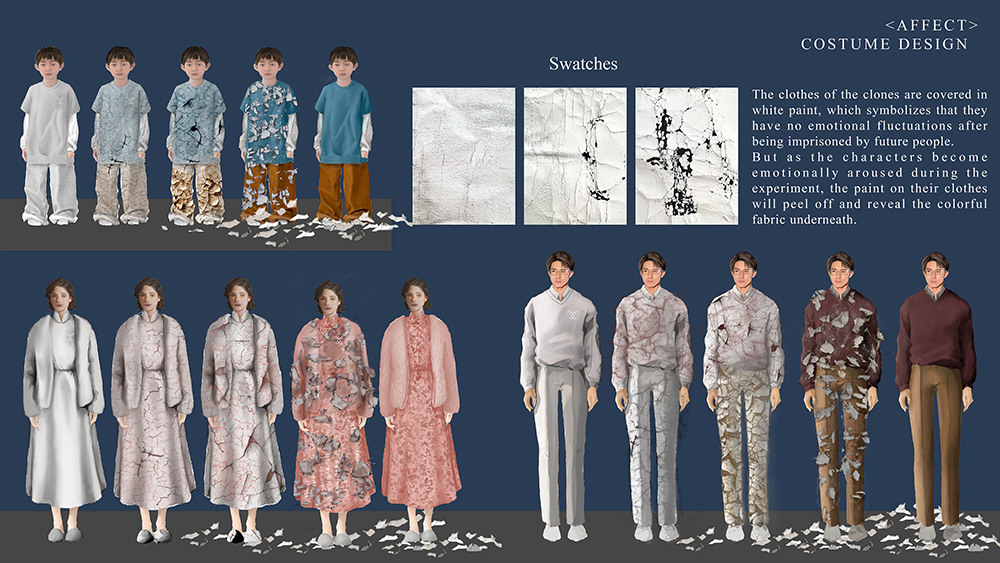 此齣戲的服裝設計選擇使用顏色作為表達情感的媒介;過去的人因多情所以衣著鮮豔,未來的人沒有情感,像機器人一般,採具磨砂玻璃質感的半透明衣著。克隆人以白色顏料覆蓋衣服布料的質感,象徵著克隆人被禁錮的情緒和狀態。當克隆人開始對實驗產生情緒反應時,他們衣服上的白色顏料開始剝落,露出最底層五顏六色的過去的服裝,演繹人類情感的釋放融化禁錮的氛圍。燈光設計強調結構的線條,使用LED光源照明燈具代替傳統的劇場照明燈具,通過強調結構的線條,讓觀眾感受到僵硬、過於理性、冰冷的氛圍。音效設計為了強調「人類情感的稀有性」,使用人工智能語音和技術電子聲音來代表未來人類和錄音,在冷漠、機械的「未來世界」和懷舊、情緒化的過去之間形成鮮明對比。作品中語音信息的運用,也象徵著情感得以保存,歷經摧殘仍能堅守。