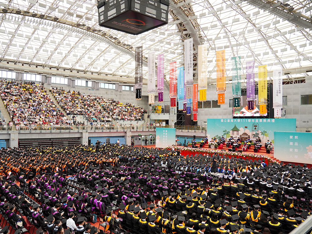 國立臺灣大學5月27日於綜合體育館舉辦111學年度畢業典禮,今年學士班畢業生有5166、碩士班畢業生有3923人、博士班畢業生有423人,總計9512人。今天滿場的畢業生與同行家長親友們均流露出驕傲與興奮的喜悅,校園內處處可見拍照留念的人群。本屆典禮以「揚帆待發 勇於追夢」為規劃主軸,期許畢業生勤奮努力持之以恆朝理想前進,勇敢踏出舒適圈,不要放棄追尋夢想,成就更好的自己。