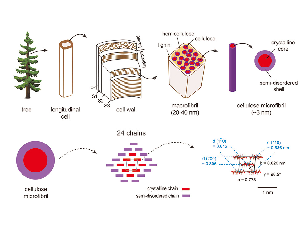 木材結構示意圖。木材纖維素主要存在於縱向細胞次生細胞壁的S2層,構成單元為納米微纖絲,我們的研究結果首次確認每束微纖絲含有24條葡聚糖,呈現出殼-核結構。