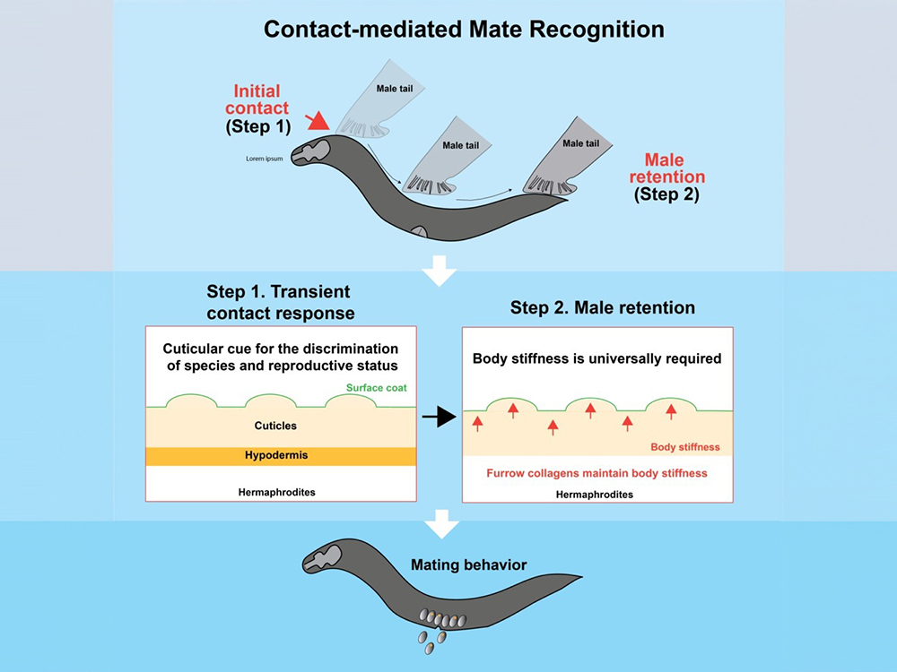在線蟲由接觸調控的伴侶辨識可以分成兩個感因子來影響雄性辨識雌雄同體。首先,雌雄同體上的表皮因子會促使雄性對潛在配偶產生contact response行為。接著,雌雄同體特定的身體硬度有助於吸引雄性停留,以完成整個交配行為。