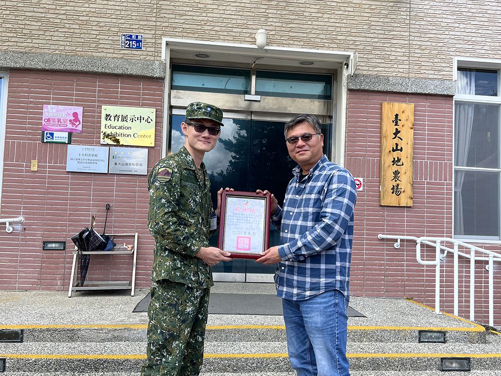 廖啟智秘書(右一)代表農場接受國軍感謝狀。