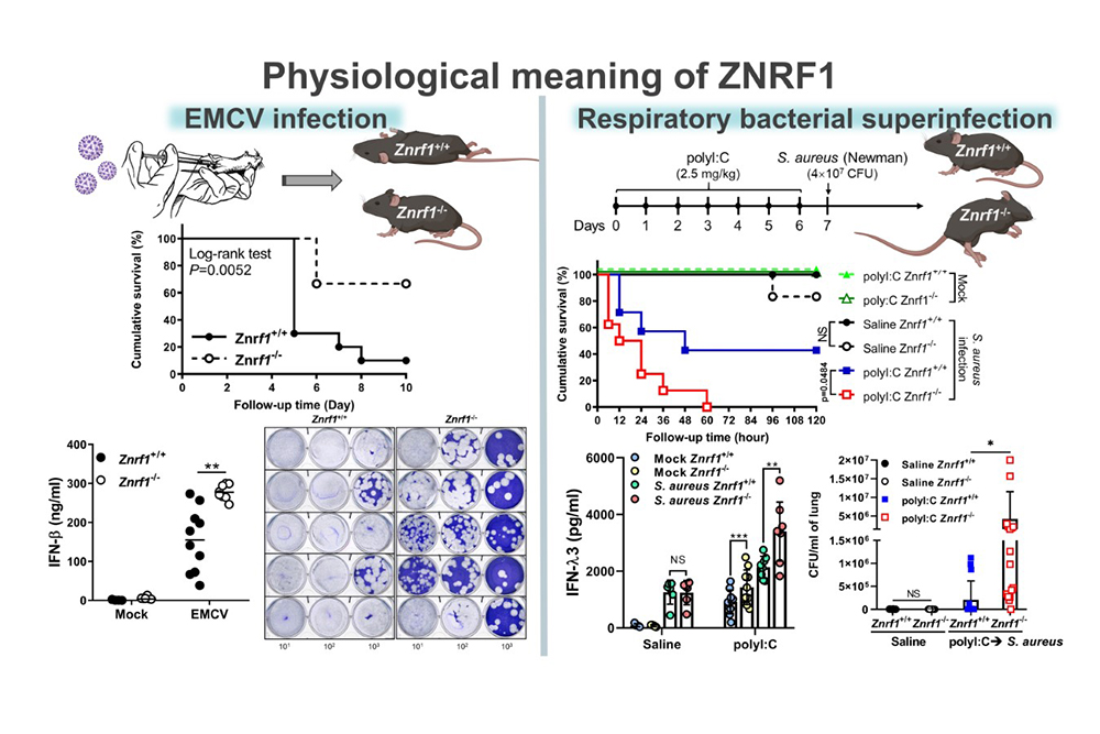 泛素化連接酶ZNRF1在生理上的意義,腦心肌炎病毒感染小鼠模型(左),評估小鼠存活率(上),以酵素結合免疫吸附分析法(ELISA)測量血清中第一型干擾素的濃度(左下)和用病毒斑分析(plaque assay)檢測腦組織中腦心肌炎病毒的效價(右下),呼吸道細菌雙重感染(右),評估小鼠存活率(上),以酵素結合免疫吸附分析法測量肺臟中第三型干擾素的濃度(左下)和用菌落形成單位(CFU)分析肺臟中金黃色葡萄球菌的生菌數(右下),在ZNRF1缺失的小鼠中,由於第一型干擾素的產生增強,這些生物體能夠更有效地抵抗腦心肌炎病毒的感染,然而在病毒引發的呼吸道細菌雙重感染下,ZNRF1扮演重要的角色,有助於減少由於干擾素引起的肺部屏障損傷的潛在風險。