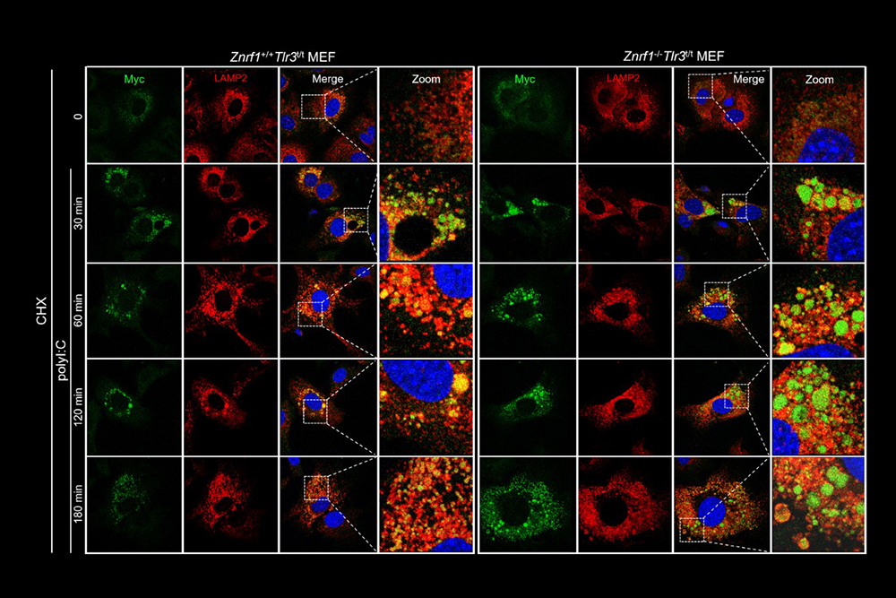 第一型干擾素(Type I interferon)在哺乳類動物抗病毒過程中扮演著主要的細胞激素角色,然而,持續的產生干擾素對宿主個體可能造成損害,容易導致自體免疫疾病(autoimmune disease)或者病毒引發細菌雙重感染的風險。第三型類鐸受體Toll-like receptor 3 (TLR3)驅動第一型干擾素免疫反應,對於哺乳類動物對抗特定RNA病毒(例如新型冠狀病毒(SARS-CoV2)和腦心肌炎病毒(Encephalomyocarditis virus)至關重要。雖然很多研究已經清楚解析宿主細胞如何啟動TLR3引發免疫反應,但調控終止TLR3介導的訊息傳遞機制仍然尚未完全了解。