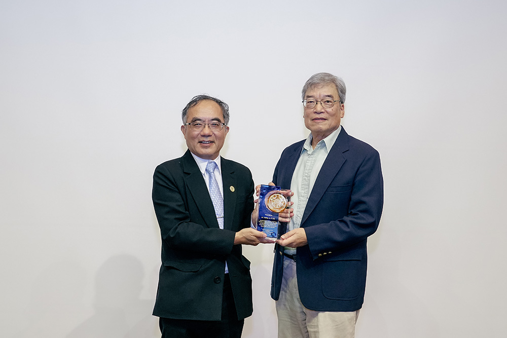 臺大校長陳文章(圖左)致贈紀念品給擔任臺大椰林講座講者的劉立方(圖右)