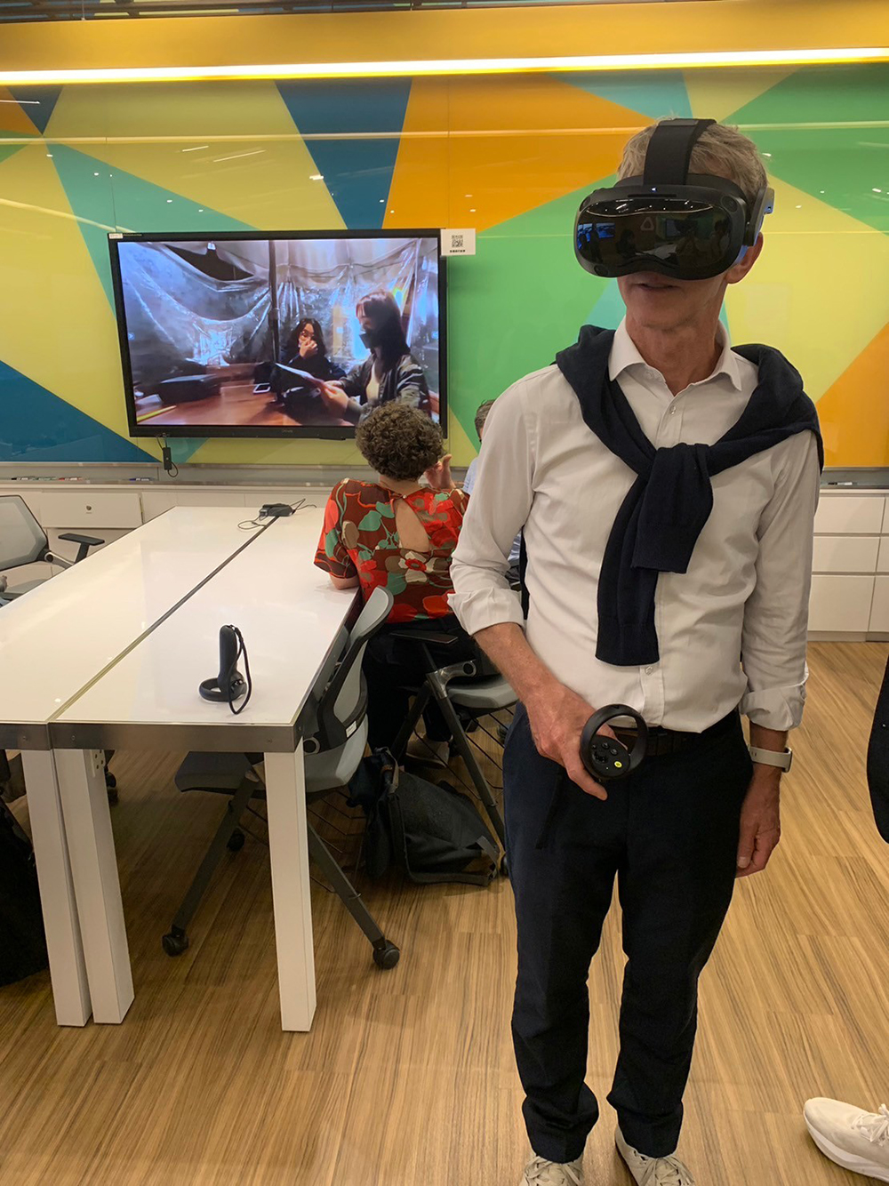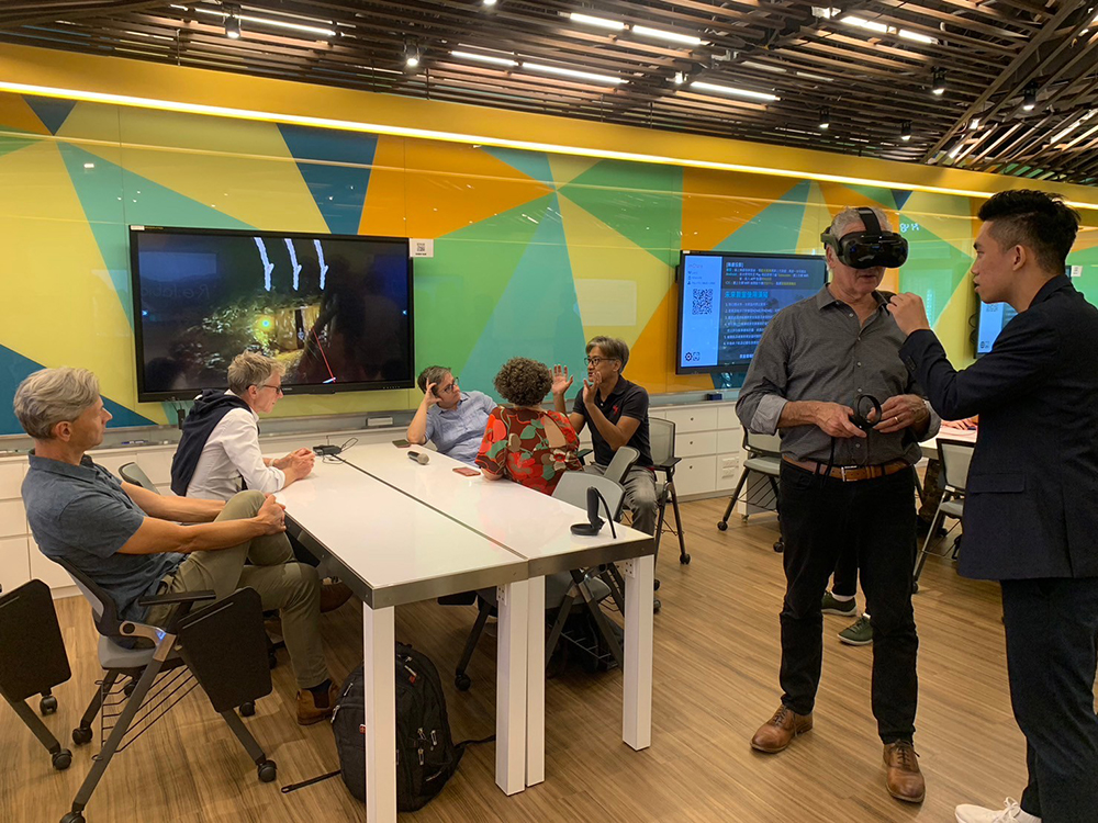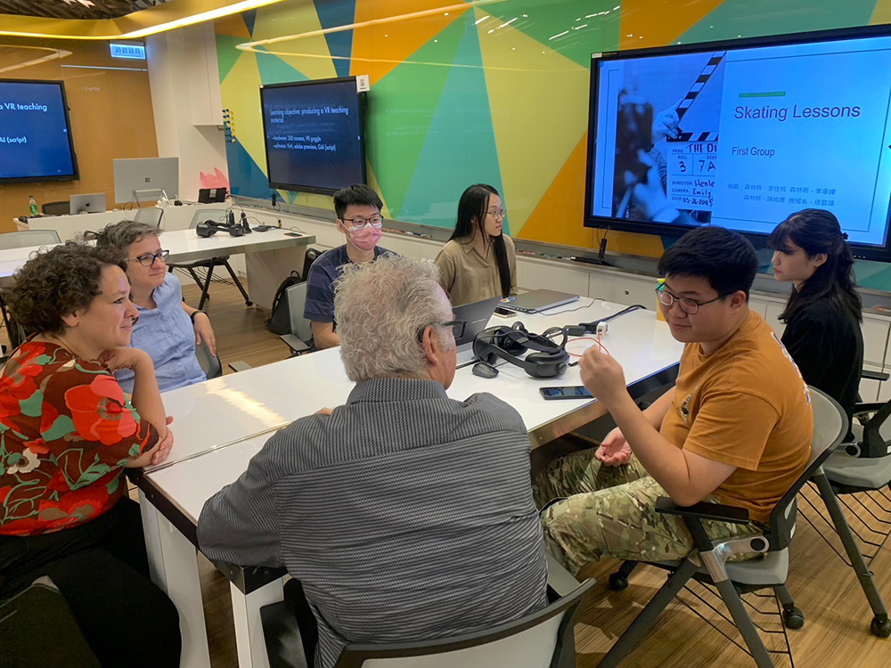 臺灣大學在今年11月6日至10日迎接來自印第安納大學(IU)與漢堡大學(UHH)8位學者,進行為期一週的訪問,教務處數位學習中心負責規劃與接待。交流主題為3校近年在數位教學發展上的經驗與成果,數習中心除分享NTU COOL學習平台、教務處未來教室、教學館錄播系統等硬體建設外,也特別安排參訪森林系教授余家斌的「應用生成式AI製作 VR教案」課程,該課程教導學生利用生成式AI工具來快速擬定教案腳此架構,以及學習教學設計原則、運用360度攝影機拍攝實境影像、影像編輯等技術,讓學生在團隊合作的學習環境下創造出VR教案。
