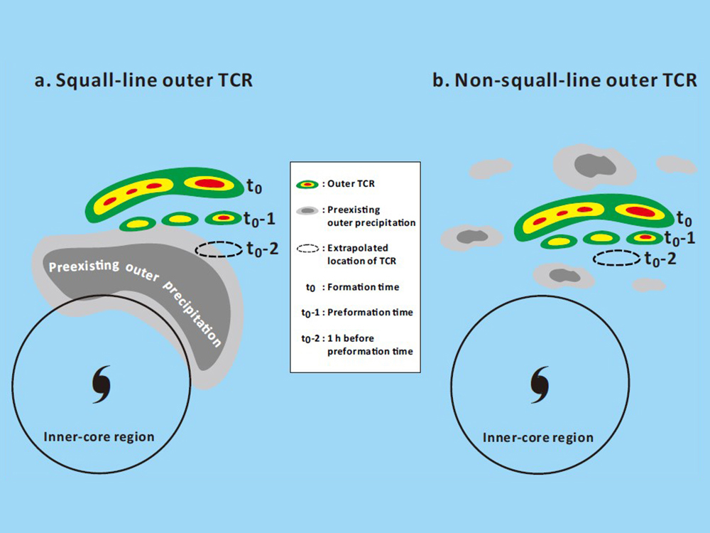 研究顯示,絕大部分的外圍雨帶(約97%)都是在熱帶氣旋外圍區域生成(outer origin),此觀測結果與理論(模擬)研究強調外圍雨帶是在熱帶氣旋內圍區域生成(inner origin)並向外移行至外圍區域的論點大相逕庭。而絕大多數外圍雨帶的移速與重力波(gravity waves)或渦旋羅士比波(vortex Rossby waves)的理論傳導速度有明顯不一致,據此推斷大氣波動對於外圍雨帶的起源並沒有直接貢獻。此外,論文進一步指出,外圍雨帶生成區域常常具有類似颮線環境的低層垂直風切與內流特性,且移速較快的類颮線(squall-line)外圍雨帶傾向於在熱帶氣旋外圍降水區的邊緣地帶形成,這些原先存在於外圍區域的降水可能為冷池(cold pool)的關鍵初始來源,並透過冷池與低層垂直風切交互作用(即颮線動力,squall-line dynamics)進而促使雨帶的生成(圖a)。另一方面,並非所有的熱帶氣旋外圍雨帶皆會表現出與颮線類似的環境與移動特徵,統計顯示這些非颮線(non-squall-line)雨帶並不少見,然而其移速相對較慢,且經常在無顯著降水或是在廣泛分散的弱降水區域中形成(圖b),這些,特性與類颮線外圍雨帶形成強烈對比。很顯然地,原本存在於熱帶氣旋外圍周遭的環境降水特徵是決定類颮線外圍雨帶與非颮線外圍雨帶的重要因子。