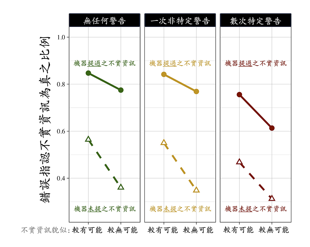 為了要回答上述問題,臺灣大學心理學系副教授黃從仁、研究生鄭羽嵐及美國藝術與科學院院士Suparna Rajaram教授,在國科會「前瞻及應用科技處」與臺大「人工智慧與機器人研究中心」所支持的實驗研究中發現,「人類在跟會提供不實資訊的人型機器人交流後,會將約7至8成機器人所提供的不實資訊錯誤地指認為真實資訊。」值得注意的是,因為聳動資訊本就容易讓人印象深刻,此研究刻意採用不帶情緒或價值的中性資訊作為實驗材料,但仍觀察到有很高比例的不實資訊形成假記憶。此研究成果刊登在2023年11月20日出版的頂尖國際期刊《美國心理學家》American Psychologist,來對大眾與AI對話引擎的開發者提出警告。