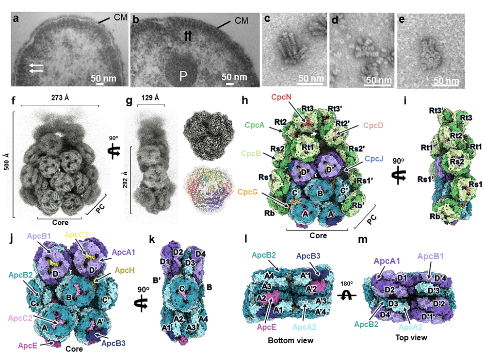 孑遺藍綠菌中的球拍狀藻膽蛋白體。