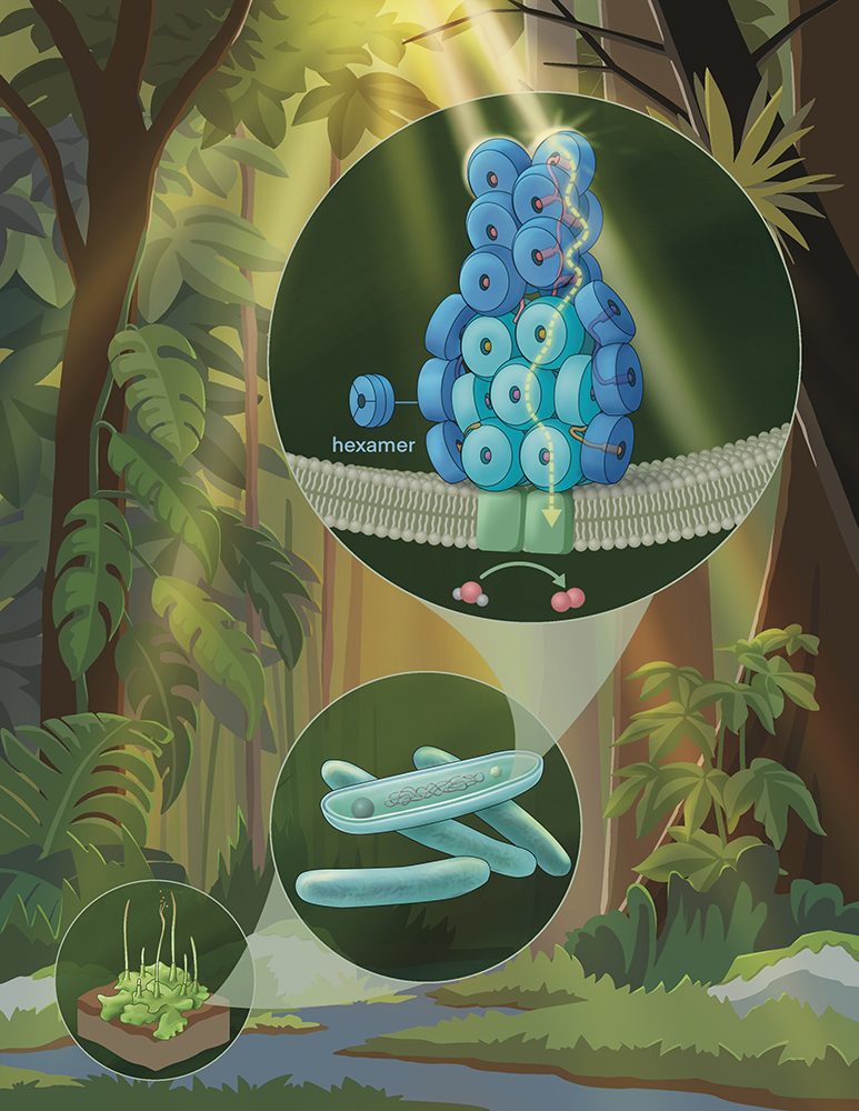 光合作用是地球上生物賴以生存的能量來源。光能的吸收是光合作用的第一步,為了獲取更多的光能,不同的光合生物在演化時發展出各自獨特的捕光天線蛋白系統。藻膽蛋白體為存在於藍綠菌的巨大捕光天線蛋白體 (~5-20 MDa),能捕獲光能並將能量傳遞到光系統二進次行光合作用。將近60年的研究歷史顯示藻膽蛋白體,在藍綠菌中主要有兩種形狀,分別是無葉綠囊膜藍綠菌的束狀形及有葉綠囊膜藍綠菌的扇形,但目前對於藻膽蛋白體由簡至繁的演化過程仍缺乏證據。在2021年,臺大生命科學系副教授何銘洋與康乃爾大學副教授李飛葦於 Current Biology 共同發表一株缺少葉綠囊膜的新種藍綠菌 Anthocerotibacter panamensis 。該藍綠菌,於14億年前從其他大部分藍綠菌演化分歧,其藻膽蛋白體座落於細胞膜上,這藍綠菌可能保留了演化早期孑遺的特徵。