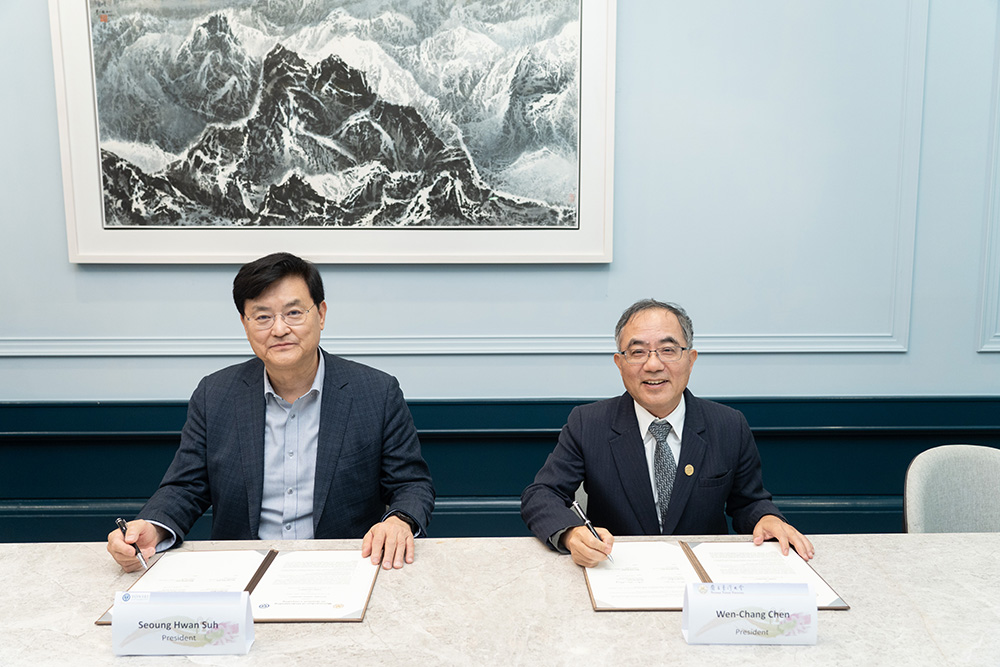 臺大校長陳文章(右)與延世大學徐昇煥校長(左)簽署量子科學與工程領域合作備忘錄。