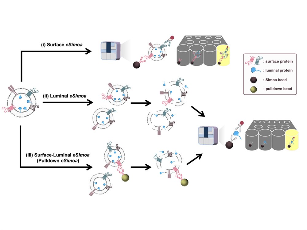 高靈敏胞外體蛋白整合式分析平台 (eSimoa) 將上游的胞外體純化與下游的胞外體高靈敏免疫分析法結合。