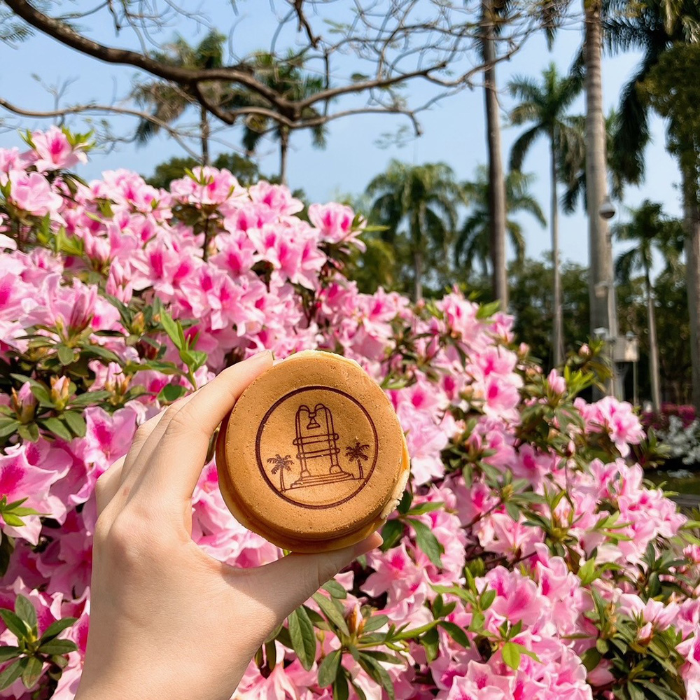 臺大總務處在今年杜鵑花節引進行動餐車(胖卡)進駐臺大校總區,於舟山路上鹿鳴堂、楓香道上社科院及辛亥門旁黑森林旁,提供多項餐點及點心,滿足學校師生及來訪者更多元、豐富的餐飲需求。圖為商家推出的傅鐘紅豆餅。
