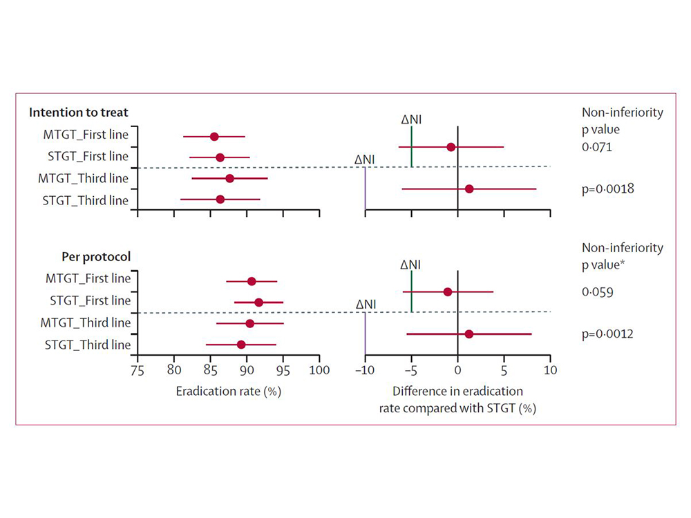 全球第一個證實抗藥性基因分子檢測技術 (MTGT, molecular testing guided therapy),在引導幽門螺旋桿菌的療效上,不亞於依照傳統細菌培養與敏感性測試引導(STGT, susceptibility testing guided therapy)的療效的臨床試驗。