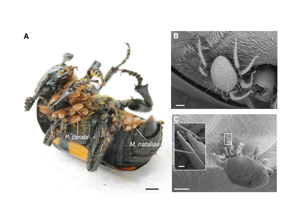 兩種蟎P. carabi與M. nataliae 在共同宿主埋葬蟲身上的空間生態區位劃分(A)。P. carabi主要分佈在蟲體胸部(B), M. nataliae則主要分佈在腹部(C)。