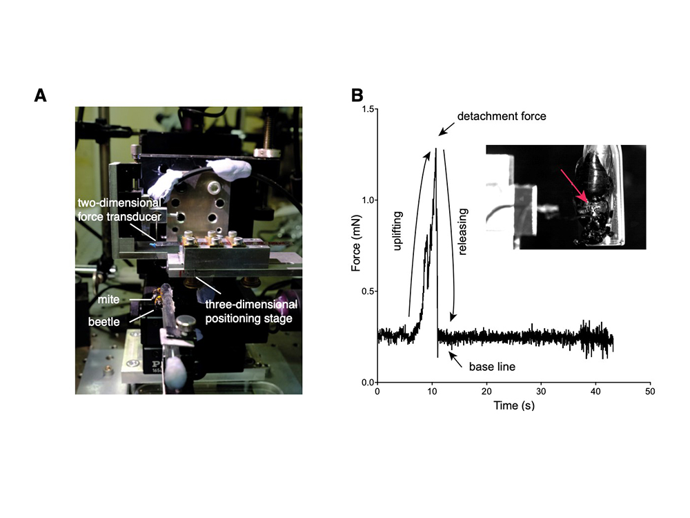 透過生物力學實驗裝置(A)測試單一蟎個體脫離埋葬蟲所需的拉力(B)。