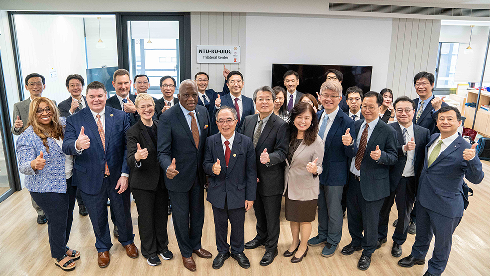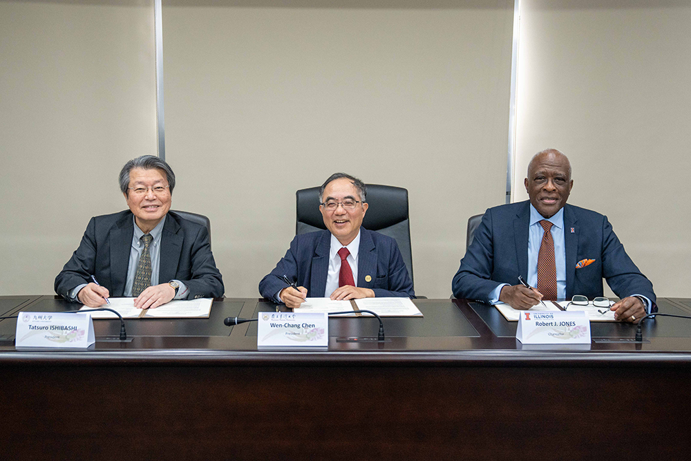日本九州大學校長石橋達朗、美國伊利諾大學香檳分校校長Robert Jones率團來訪,與臺灣大學校長陳文章共同簽署臺大九州UIUC三校聯合中心合作備忘錄,未來校間交流更系統化地推動醫學、工程、農業、人文社學等領域的交流。