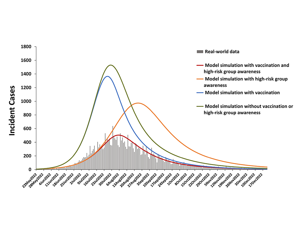 為釐清疫苗與衛教對美國M痘防治的成效,研究團隊建構數理模型模擬M痘在美國的傳播,根據2022年5月22日至12月22日期間美國M痘病例流行曲線進行擬合,成功估計出2劑疫苗施打與高風險族群危機意識對美國M痘疫情的防治效果。結果顯示M痘基礎再生數 (R0) 在高風險群與低風險群分別為3.88和0.39,估計71.8% M痘病例來自高風險族群。若無衛教,在緊迫時間內所能完成的疫苗接種劑數僅能預防21.2% (10.2%–24.1%) 病例;若無疫苗接種,僅靠衛教高風險群危機意識導致的性行為改變只能預防15.4% (14.3%–20.6%) 病例。但實際上美國因同時實施2種公衛措施產生強大協同效應 (synergism),預防64.0% (43.8%–69.0%) 病例,成功控制美國M痘疫情。