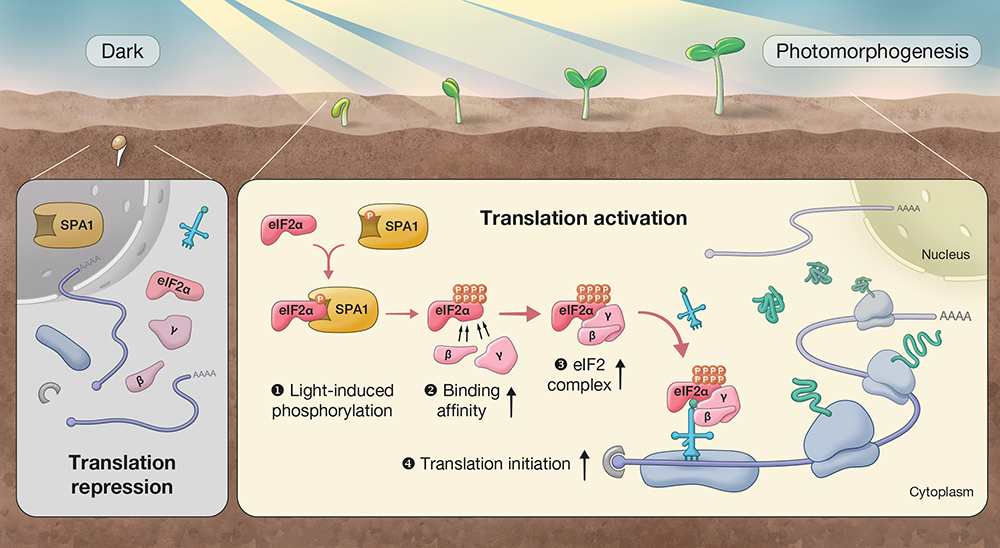 臺灣大學生化科技系助理教授鄭梅君的研究團隊發現,阿拉伯芥中的磷酸酶SPA (SUPPRESSOR OF PHYA-105) 在光照刺激下,可以藉由磷酸化真核轉譯啟動因子eIF2α來促進轉譯作用。SPA磷酸酶在光照下會由細胞核移動至細胞質內,與真核轉譯啟動因子eIF2α產生交互作用並將其磷酸化。然而此磷酸化位點不同於以往在哺乳動物與酵母菌中發現的典型磷酸化位點,而是位於eIF2α的C端。藉由各種磷酸化點突變的轉殖株建立,研究團隊發現此磷酸化可以藉由促進轉譯啟動因子複合物的組成,來促進轉譯作用,並導致植物進行光型態發生。研究團隊也將不同物種的蛋白質序列進行比對分析,發現動物缺少與植物相同的C端磷酸化位點,也再次證明植物具有和動物不同的調控機制。總結來說,光照可以促進植物eIF2α的C端被磷酸化並調控轉譯作用效率。此研究成果不但回答長久以來無法了解的問題,更提供給未來研究一個全新的思考方向。