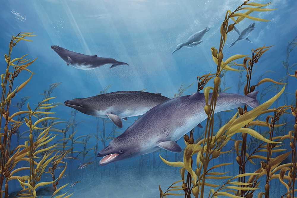 Fucaia humilis(謙遜福卡鯨)與其巨藻生態系的復原圖(孫正涵繪製,取自Tsai et al 2024 Current Biology)。