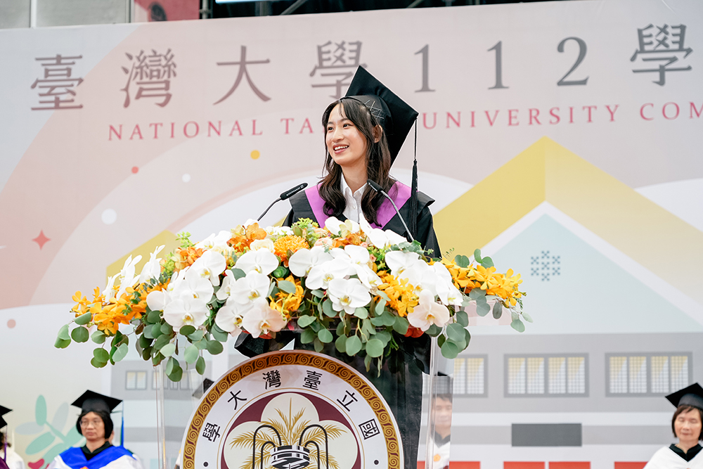 另外,今年本地生及國際生的畢業致詞代表分別為政治學系國際關係組的李嘉嘉,以及中國文學系來自日本的里見明叡 (Akiei Satomi)。李嘉嘉於致詞時表示,求學期間經過學業、社團、是否轉系及出國交換的矛盾及徬徨,最後雖咬緊牙關畢業,卻不時仍想著這4年「我沒有選擇的那條路」是什麼樣子?自己是不是從寶山空手而回?然而,在與同學、好友聊過,李嘉嘉體悟當一心一意走在自己所選的道路上時,整個世界都是可以恣意揮灑的畫布,一切經歷都將成為顏料:一切鍛鍊都會成為生命中最耀眼的珍珠。她與畢業生們共勉,「讓我們勇敢踏出臺大」。