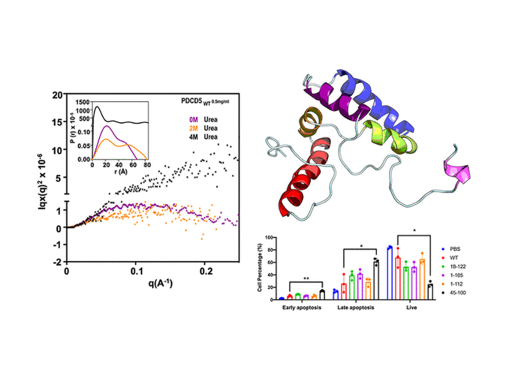 農業化學系/生化科學所/基因體與系統生物學程教授徐駿森研究團隊,希望通過結構生化與生物物理的研究,闡明TgPDCD5蛋白的作用機制與功能。利用圓二色光譜、螢光光譜和同步輻射X光小角度散射等技術,研究團隊首先提供TgPDCD5具有熔球狀特徵的確鑿證據。進一步的NMR解析顯示,TgPDCD5由5個α螺旋組成,並呈現高可動性的熔球態,同時化學位移擾動實驗亦建立了TgPDCD5與硫酸肝素多醣之間交互作用的結構基礎。有趣的是,研究團隊發現另一種由弓形蟲「彈藥庫」分泌的脯胺酸異構酶TgCyp18,可以對TgPDCD5的脯胺酸順反異構催化具有調節作用,有助於TgPDCD5與硫酸肝素多醣的結合和分離調控。這樣的調控猶如一艘船在靠岸時下錨來穩定,而離岸時則起錨以便航行。因此,研究團隊提出TgPDCD5進入細胞的分子機制,先通過與細胞表面肝素多醣的結合,而後藉由蛋白質熔球態保持足夠柔韌度,猶如微妙的蛋白質之舞,展開膜易位而進入細胞。