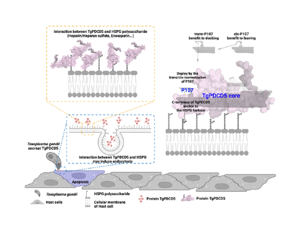 弓形蟲病是一種由弓形蟲(Toxoplasma gondii)感染引起的全身性疾病,特別對孕婦和免疫系統不全者風險更高。弓形蟲通過傳播至貓作為最終宿主,並在其他溫血動物,包括人類在內,作為中間宿主進行傳播。為了避免宿主的免疫攻擊,弓形蟲會分泌效應蛋白質TgPDCD5,這種蛋白質會引發宿主巨噬細胞(macrophage)的細胞凋亡(apoptosis)。儘管TgPDCD5如何進入宿主細胞的機制尚不完全清楚,但已有研究提出,TgPDCD5可能通過與宿主細胞表面的肝素或硫酸乙醯肝素蛋白聚醣交互作用,誘導胞吞作用而進入細胞。然而,由於蛋白質作為生物巨分子一般難以通過細胞膜。
