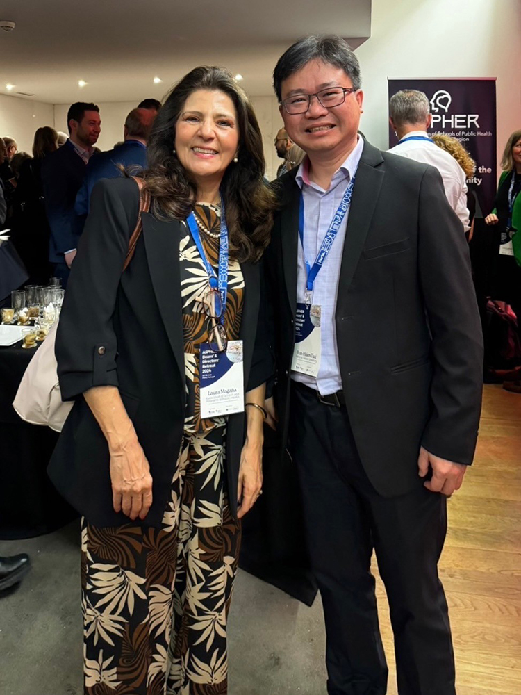 臺大公衛學院GHP蔡坤憲主任參與2024年ASPHER Deans’ & Directors’ Retreat時與公衛專家合影 (中) ASPPH主席Dr. Laura Magaña。