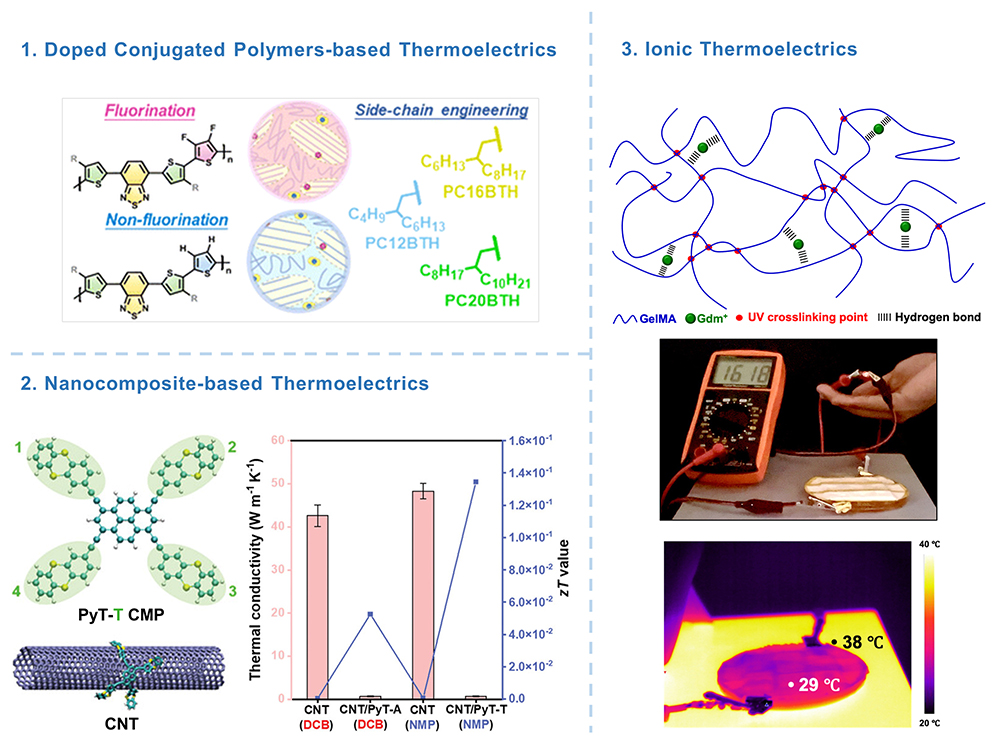 臺灣大學工學院材料科學與工程學系教授劉振良研究團隊致力於開發有機熱電材料,以解決無機熱電材料存在的低Seebeck係數(即單位溫差下元件所產生的電位差)、毒性疑慮、低延展性及不易加工等缺點。研究成果已應用於微型家電廢熱回收與穿戴式發電裝置等具有持續溫差的場域。研究重點涵蓋以下3個熱電材料系統: