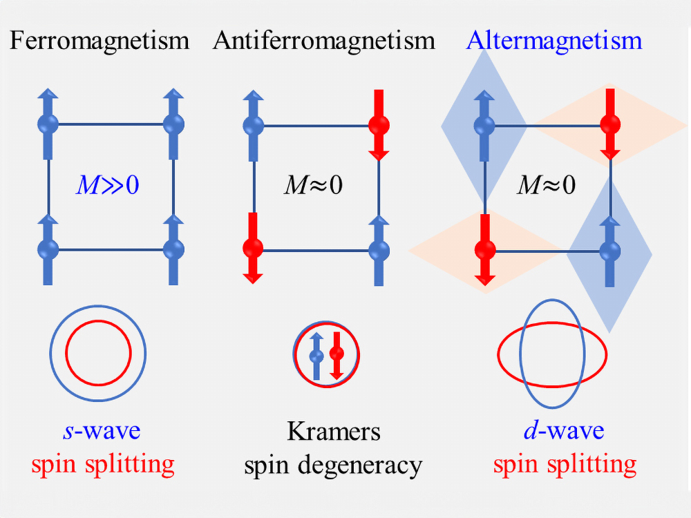 鐵磁性 (ferromagnetism, FM) 和反鐵磁性 (antiferromagnetism, AFM) 一直是磁性 (magnetism) 的兩個主要分類。近兩年來,交替磁性 (altermagnetism, AM) 的概念被理論學家提出,被劃分為不同於鐵磁性和反鐵磁性的第三類磁性,給傳統的磁性分類帶來突破性的進展。在理論預測中,AM兼具FM和AFM的優勢,沒有磁矩 (M ≈ 0),不易受外界干擾,但在特殊方向能帶有自旋分裂 (spin splitting),產生自旋激化流 (spin polarized current) 翻轉磁矩。是自旋電子應用夢寐以求的理想材料,能實現高密度、高穩定度、讀寫快速的磁性隨機存儲記憶體 (MRAM)。