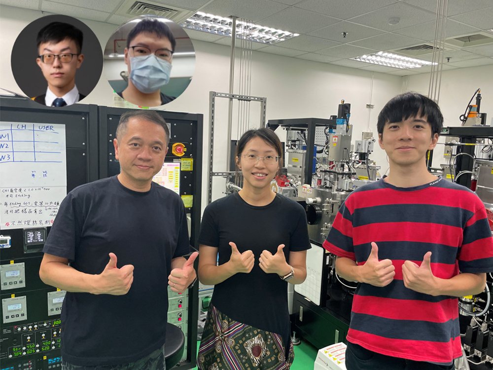 團隊成員合影。上排為台大物理系廖晉德同學(右),田宇誠同學(左),下排為王裕鈞同學(右),黃斯衍教授(左),以及凝態中心曲丹茹助理研究員(中)。