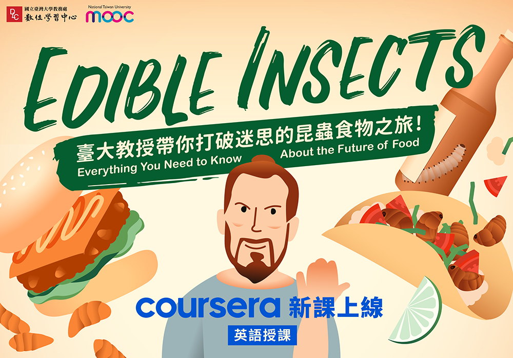 自2018年開授「食用昆蟲」實體課程以來,這門英文課程已成為臺大最受歡迎的選修課程之一。這堂課是Coursera第二個關於昆蟲的大型開放線上課程,但卻是第一個專注於昆蟲作為食物或飼料的課程,也是臺大昆蟲學系目前唯一的MOOCs課程,並在Coursera上獲得4.9/5的傑出評分。