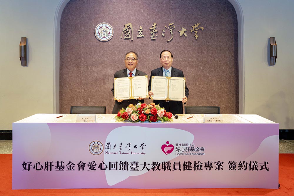 臺大校長陳文章與好心肝基金會董事長許金川簽署「好心肝基金會愛心回饋臺大教職員健檢專案」合作備忘錄。