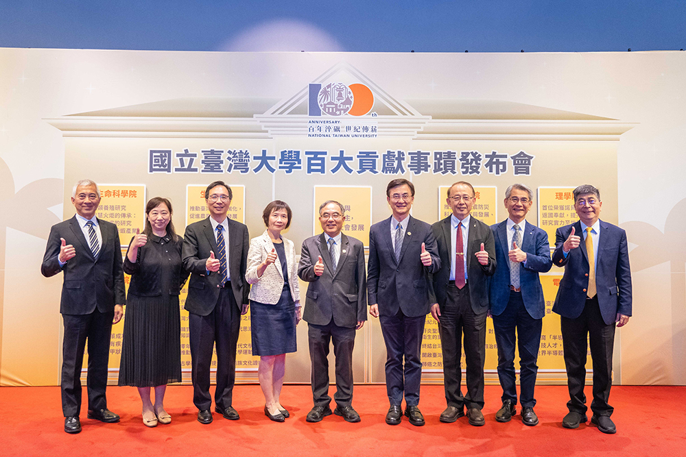 臺灣大學舉辦首屆百大貢獻事蹟發布會,說明各學院入選事蹟的臺大師長。圖左至右分別是工學院土木學系教授蔡克銓、生物資源暨農學院副院長王淑珍、醫學院院長倪衍玄、文學院院長鄭毓瑜、校長陳文章、理學院院長吳俊傑、生命科學院院長江伯倫、公共衛生學院院長鄭守夏,以及電機資訊學院院長吳宗霖。