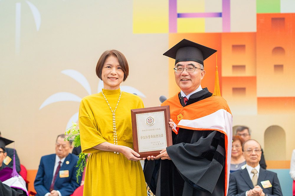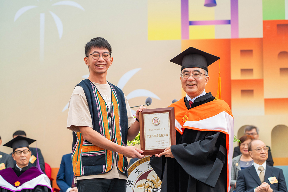 最後,典禮中頒發「學生社會奉獻特別獎」,今年度為鼓勵學生實踐永續發展目標與社會責任精神,增加1名得獎者。獲獎者共4名,分別是心理學系李冠郁同學、公共衛生學系黃映潔同學、森林環境暨資源學系陳忠峻同學;團體獎則是「月月老酥」,以表揚他們關懷社會、發揮利他精神的優秀成果,實踐臺大「敦品勵學、愛國愛人」校訓,值得同學們效法。