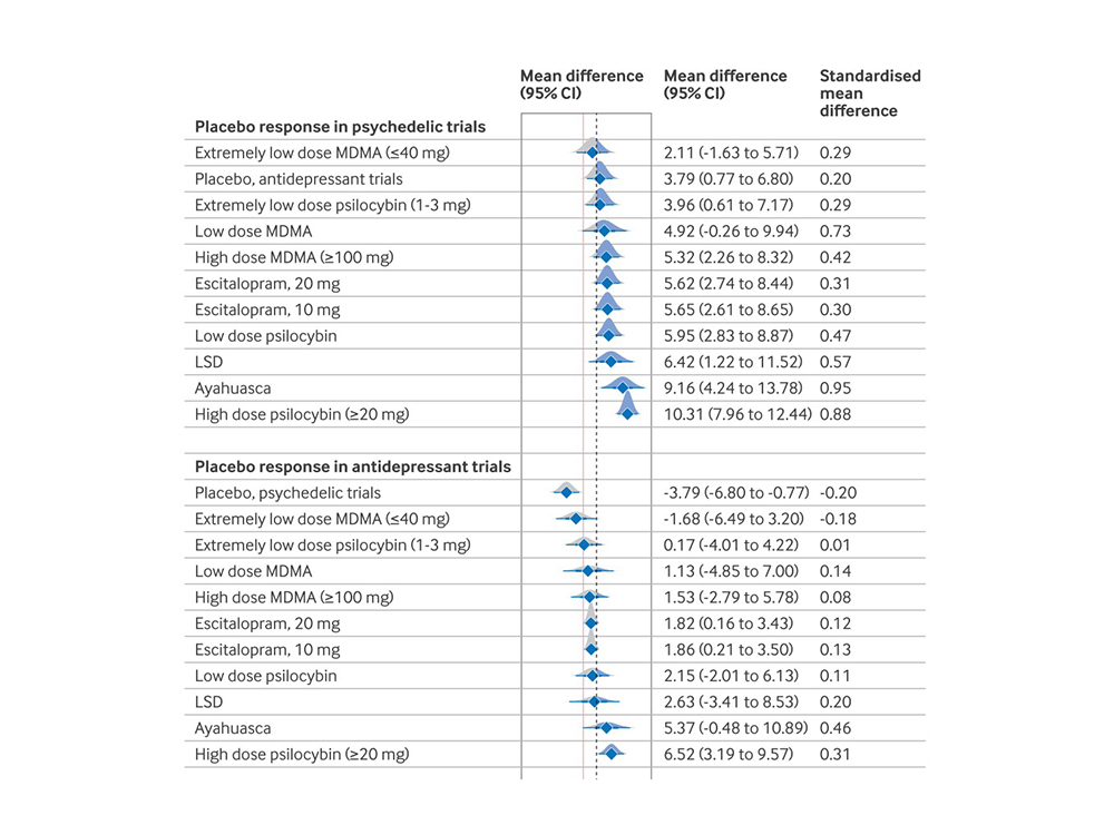 不過由於迷幻藥物的藥理作用明顯,受試者往往能夠知道自己是否真的接受到迷幻藥物還是僅接受到安慰劑,因此研究過程可能無法順利盲遮。此研究透過網路統合分析,讓迷幻藥物能夠與盲遮成功的安慰劑比較,進而分析出迷幻藥物實際上可能的療效。這項研究結果已刊登在世界醫學頂尖期刊《英國醫學會雜誌》British Medical Journal,對於評估使用迷幻藥物治療憂鬱症,做出重要的貢獻。