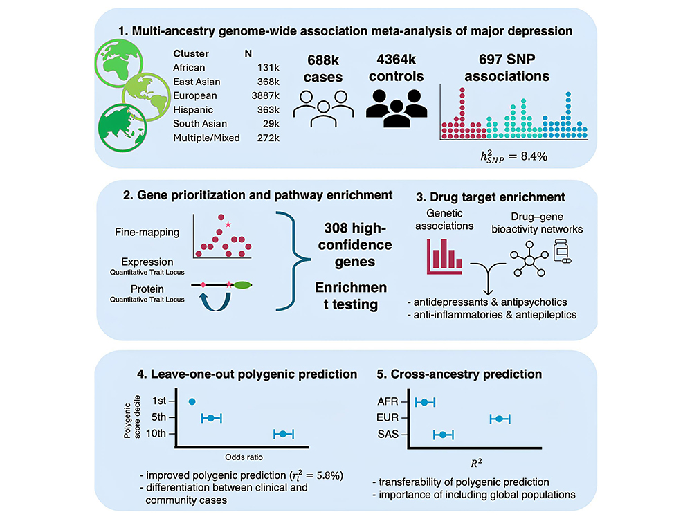 此研究是全球最大且最具族群多樣性的重鬱症遺傳研究,發現近300個過去未曾報告與重鬱症相關的遺傳變異。這些新發現的相關遺傳變異主要歸功於納入非洲裔、西班牙裔、東亞裔和南亞裔的受試者。過去,有關重鬱症遺傳學的研究主要集中在歐洲的白人族群。因此,奠基於遺傳學而發展的療法可能在其他族群中無法見效,進一步擴大健康不平等。此研究分析來自全球29個國家,超過500萬人的匿名遺傳資料,其中1/4的受試者為非歐洲血統。研究人員共識別出近700個與重鬱症發展相關的遺傳變異,其中近半數未曾被發現與重鬱症相關,並牽涉308個特定基因。
