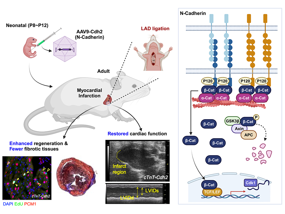 在機轉方面,團隊發現N-cadherin透過C端與β-catenin結合,使心肌細胞中β-catenin的蛋白穩定性及表現量上升,在受損傷後Wnt訊息傳遞刺激時能大量活化,入核調控心肌細胞複製增生相關基因表現,促進心肌再生。在心肌細胞中專一性剔除N-cadherin,會阻礙新生小鼠心臟再生修復;在成鼠心臟以AAV9載體進行心肌專一性過表達N-cadherin,則能有效使成鼠心肌細胞重新啟動細胞週期,進行複製增生,並改善心肌梗塞後的心臟功能,改善心臟衰竭。未來可望利用調控N-Cadherin表現量及活性,作為心肌梗塞及心衰竭患者的新型治療。這項研究工作最重要的執行者為藥理所碩士班畢業生曾意軒及博士後研究員蔡亦為,其他共同作者為藥理所游閔亦,許芸嘉,宋瑋倫及吳育碩博士。