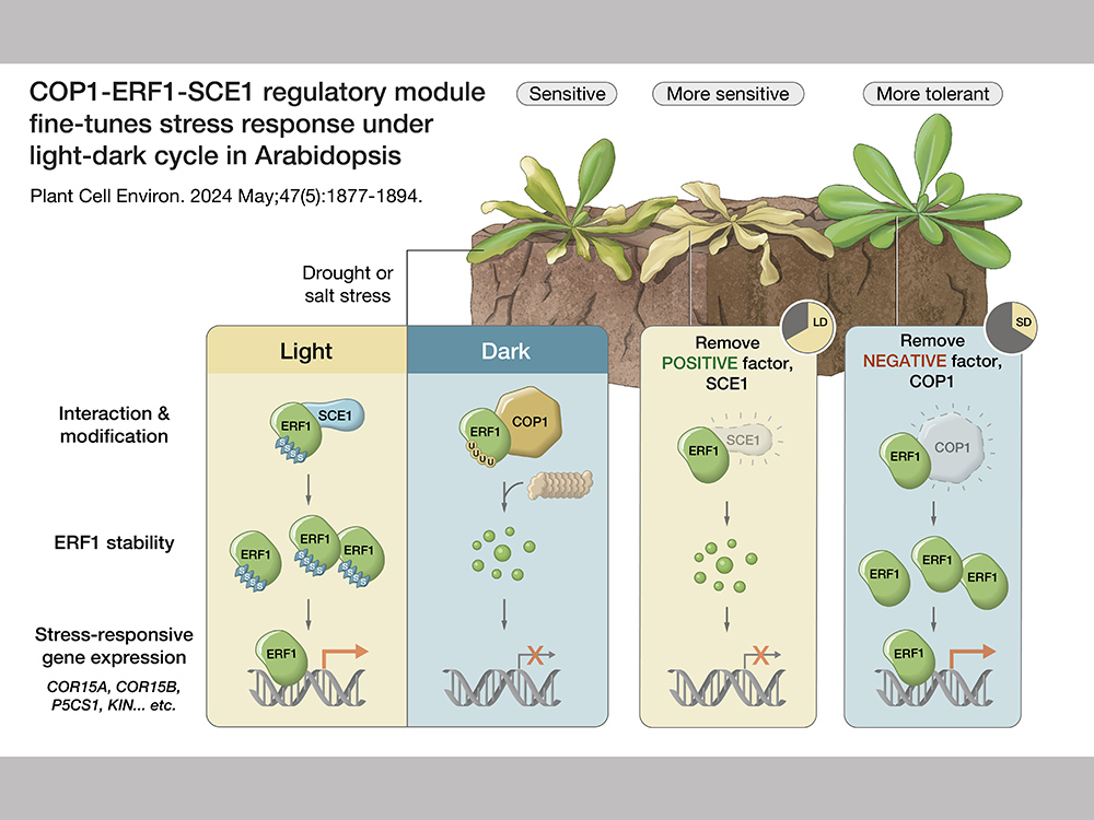 乙烯反應因子ETHYLENE RESPONSE FACTOR 1 (ERF1) 是植物賀爾蒙乙烯的訊息傳遞下一個非常重要的轉錄因子,其不僅在抵禦細菌與真菌導致的生物性逆境中扮演重要角色,也可以提升植物面對非生物性逆境的耐受能力,例如乾旱以及高鹽逆境。雖然ERF1是個重要的轉錄因子,但卻發現ERF1蛋白質在黑暗下非常不穩定。為了解植物如何調控ERF1蛋白質的穩定性,研究團隊利用酵母菌雙雜合系統,篩選出兩個可以和ERF1交互作用的蛋白—類泛素黏合酶SUMO-CONJUGATING ENZYME 1 (SCE1),以及泛素黏合酶CONSTITUTIVE PHOTOMORPHOGENIC 1 (COP1)。研究團隊證實這兩個黏合酶酵素可以分別在光照與黑暗的條件下,調節ERF1的穩定性,並進一步調節植物的逆境反應。