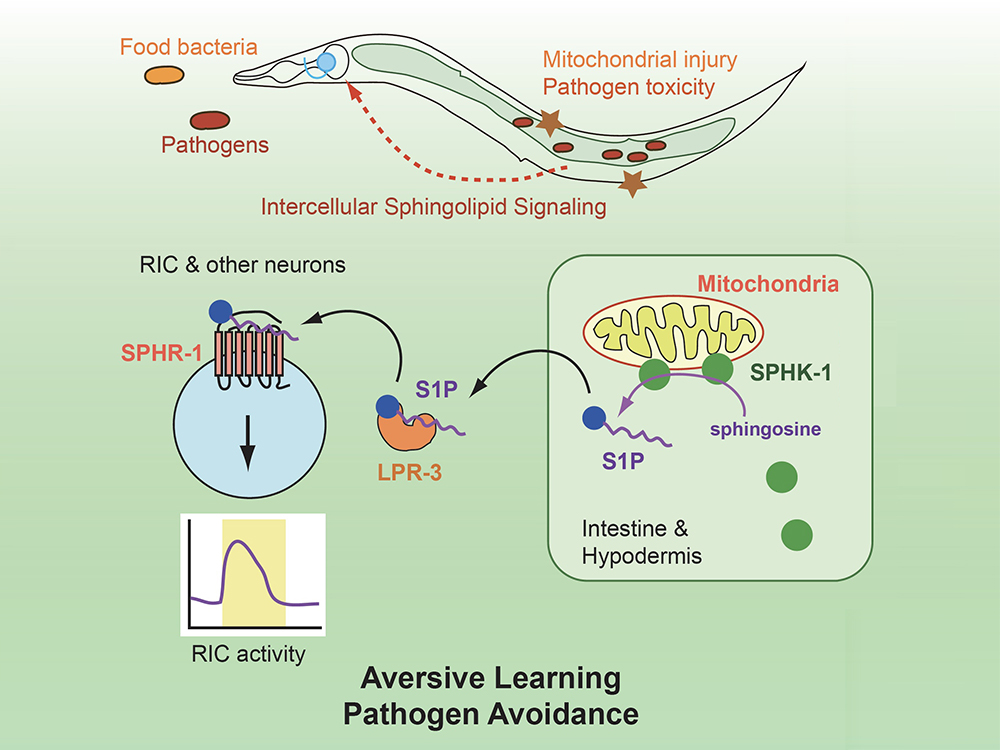 線蟲是當代行為神經科學中最重要的模式生物之一,由於遺傳學工具的先進,特別適合用來探討身體組織與神經系統如何互動。潘俊良教授實驗室透過抑制粒線體功能產生的生理壓力,誘導線蟲對細菌的氣味產生負面記憶。團隊中的吳毓純博士發現,腸道與表皮組織透過名為鞘胺醇激酶(sphingosine kinase, sphk-1)的酵素,產生磷酸鞘胺醇(sphingosine-1-phosphate, S1P),並將S1P分泌至胞外,由LPR-3 Lipocalin脂蛋白運送至線蟲腦部。S1P會與RIC神經元上的SPHR-1受器結合,刺激RIC並透過RIC所分泌神經激素蛸胺(octopamine),來引導線蟲產生對細菌氣味的厭惡記憶。此篇研究的重要性在於發現從腸道、表皮等周邊器官可以產生直接影響學習與記憶的訊號分子,將我們對於學習機制的了解,拓展到神經系統以外的組織,為「腸腦軸」(gut-brain axis) 在關聯學習中的角色提出有力的證據。